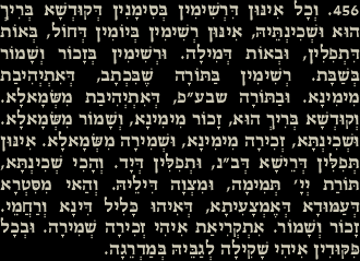 456. Todos aqueles que são marcados com os sinais do Santo Único, abençoado seja Ele, e Sua Shechinah: com o sinal do Tefilin e o sinal da circuncisão durante os dias da semana, e são marcados com 'lembrar' e 'manter' no Shabbat, e eles são marcados pela Torah escrita dada pela direita e a Torah Oral dada pela esquerda. Com o Santo Único, abençoado seja Ele, 'lembrar' é da esquerda e 'manter' da direita. Também com a Shechinah 'lembrando' é da direita e 'mantendo' da esquerda. Então também o Tefilin Principal A HASTE DO HOMEM É DA DIREITA. E o Tefilin da mão, DA ESQUERDA. Então a Shechinah é chamada "A Torah de Hashem é perfeita" (Tehilim 19:8), DISTO É O LADO DIREITO, e o preceito DO LADO ESQUERDO. Isto tudo é da direção da Coluna Central, A SABER ZEIR ANPIN, que contém Julgamento e Misericórdia, SENDO 'lembrar' e 'manter'. E DESTA POSIÇÃO, MALCHUT é também chamada 'lembrando' e 'mantendo', do ponto central dos preceitos ela está em igual nível com ele.
