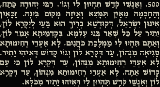 500. "E você deve ser um santo homem para MIm" (Shemot 22:30): Rabbi Yehuda começou: "Mas onde a sabedoria deve ser achada? E onde é o local de entendimento?" (lyov 28:12). Afortunada é Yisrael como o Santo Único, abençoado seja Ele, desejado para honrá-los sobre toda humanidade. Primeiro Ele disse para eles, "e você de ser para Mim um reino dos sacerdotes" (Shemot 19:6). Nós nunca removemos deles Seu grande amor, tanto assim que Ele os chamou, "uma grande nação" (Ibid.), considerando uma DECLARAÇÃO MAIS DIGNA. Amor não foi removido até Ele os chamá-los "Para vocês que são pessoas santas" (Devarim 14:2). Ele não removeu Seu amor anté Ele os chamar, "E você deve ser um santo homem (lit. 'homem de santidade') para Mim," a declaração mais digna.